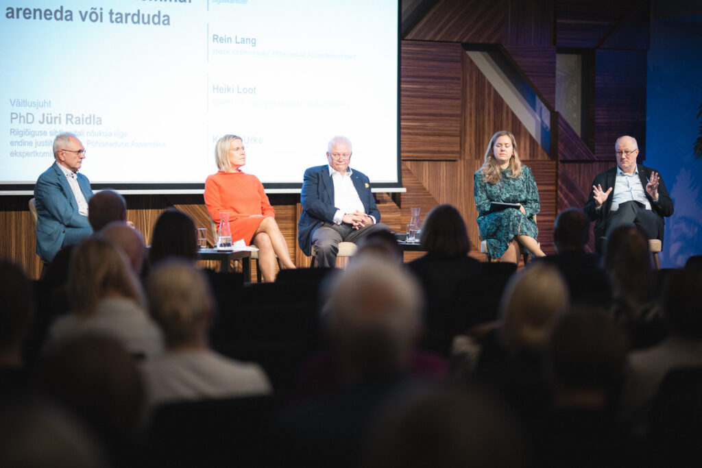 Riigiõiguse teise paneeli „Põhiseaduse dilemma: areneda või tarduda“ arutelus osalesid õiguskantsler Ülle Madise, endine justiitsminister ja Põhiseaduse Assamblee ekspert Rein Lang, riigikohtunik ja riigiõiguse sihtkapitali nõukoja esimees Heiki Loot ja Kaitseministeeriumi rahvusvahelise õiguse valdkonna juht ja Riigiõiguse aastaraamatu tegevtoimetaja Kristel Urke. Arutelu juhtis riigiõiguse sihtkapitali nõukoja liige Jüri Raidla.